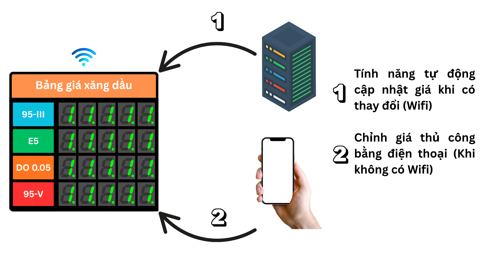 Sản phẩm tích hợp cả 2 chế độ: cập nhật giá thủ công qua điện thoại và tự động đồng bộ dữ liệu khi có sự thay đổi giá xăng dầu, đảm bảo luôn hiển thị đúng và kịp thời.